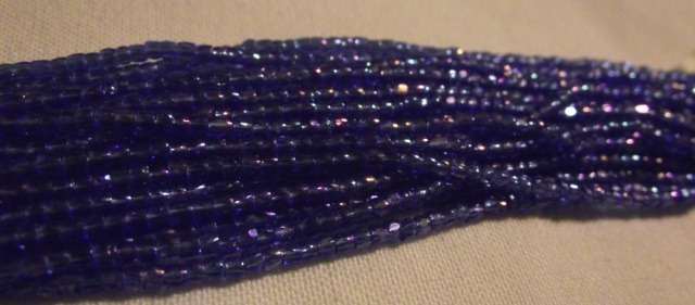Sapphire AB 3 cut beads. Sold by the hank.