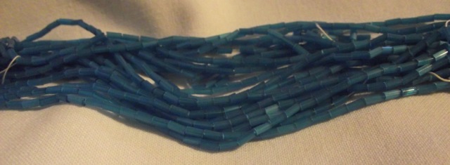 Blue Satin bugle beads. Sold by the hank.