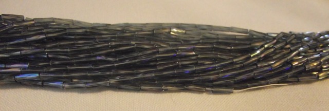 Grey AB Twisted bugle beads. Sold by the hank.