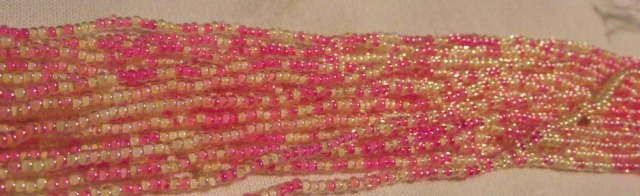 Mixed Pink and Yellow Color Lined seed beads. Size 11. Sold by the hank.