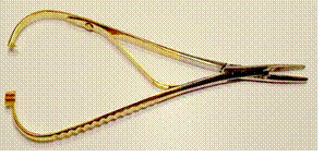 Gold handled locking needle nose pliers. Stainless steel. Snaps shut to hold things in place.