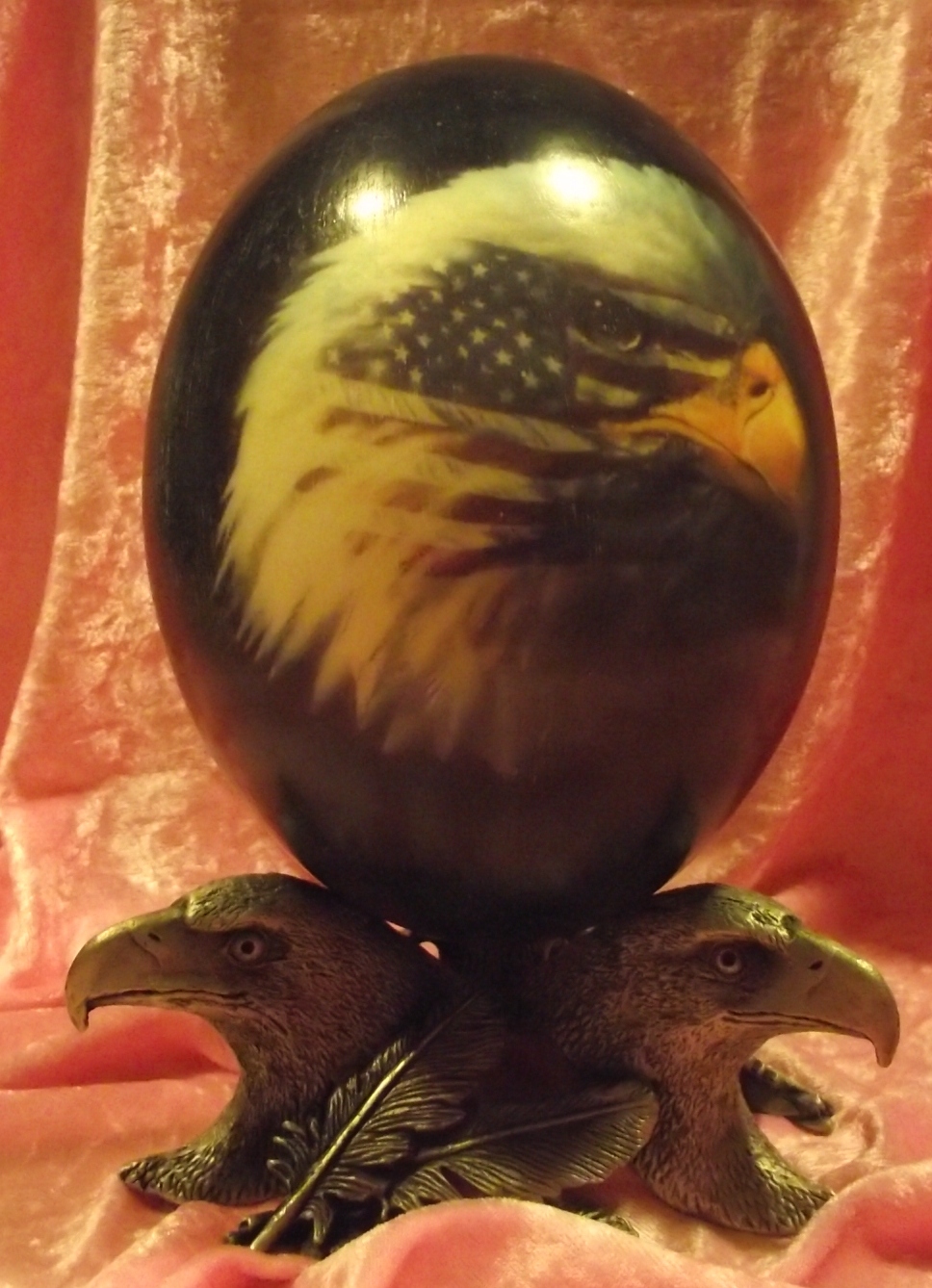 Decoupaged Ostrich egg with a crackle finish. This is the back view. Stand not included.